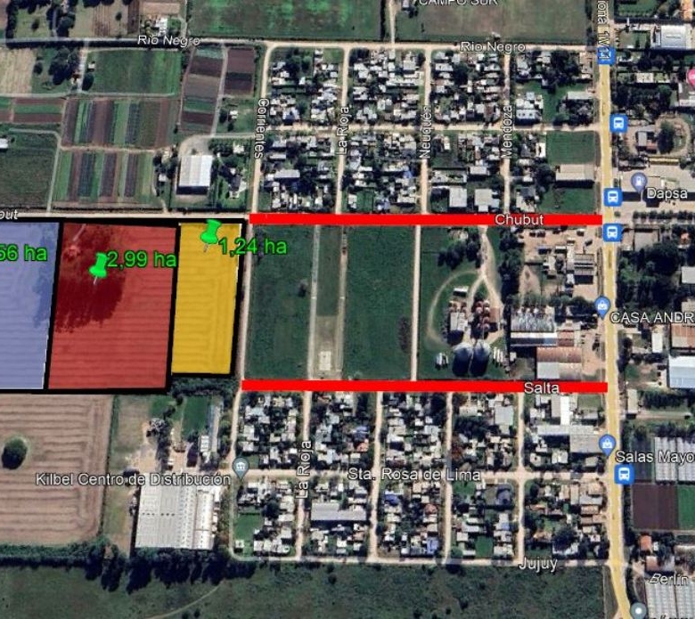 Compuesta de 3 fracciones de terreno a sólo 400 metros de la Ruta Nacional Nro. 11 sobre calle Chubut esquina Corrientes. Cuenta con casa para casero y añeja arboleda.