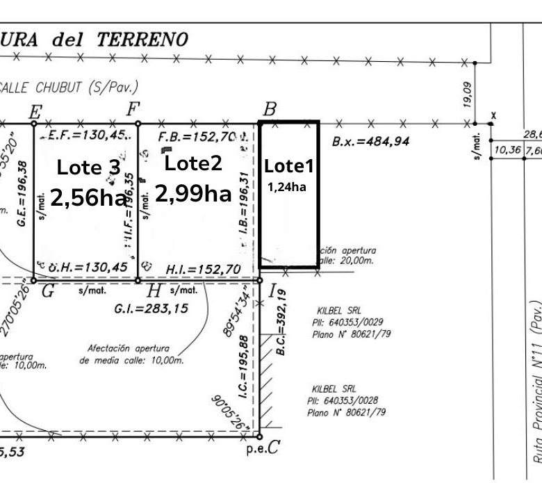 Medidas: Las 3 parcelas poseen un frente al Norte sobre calle Chubut con mejorado ripio. de 349,75 mts y un fondo de 196 mts.